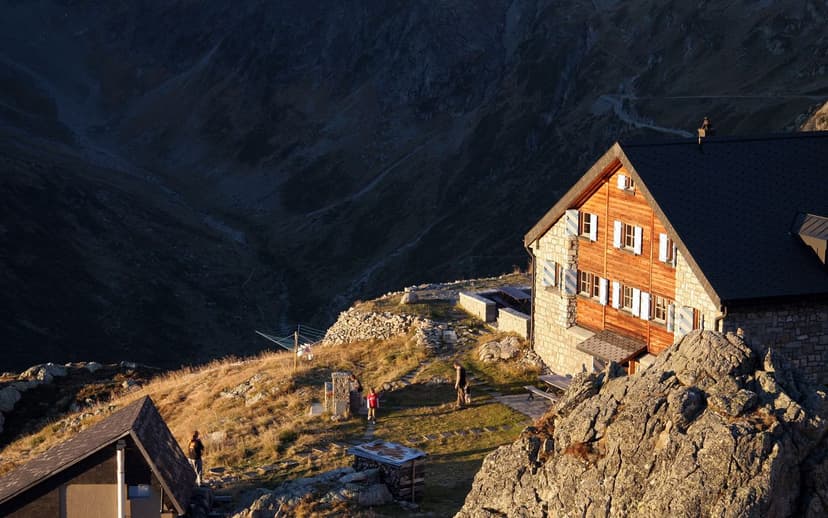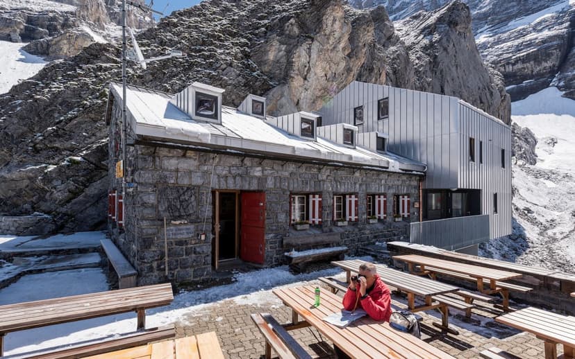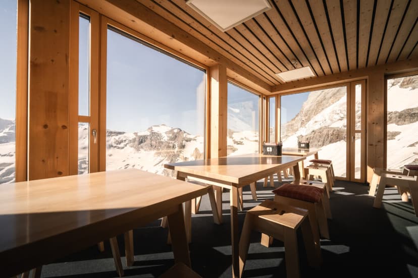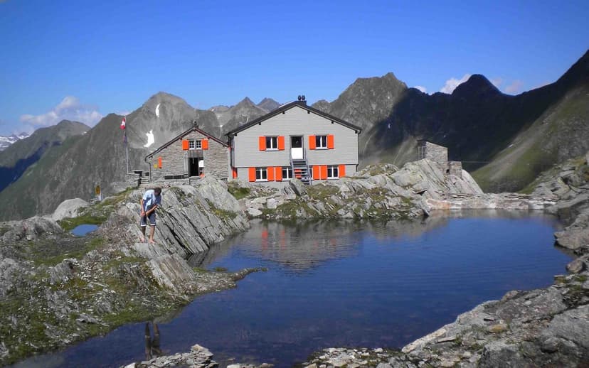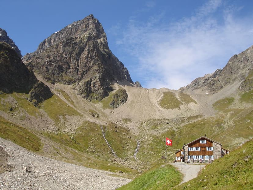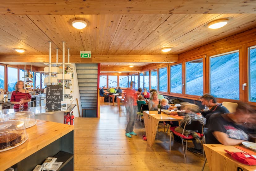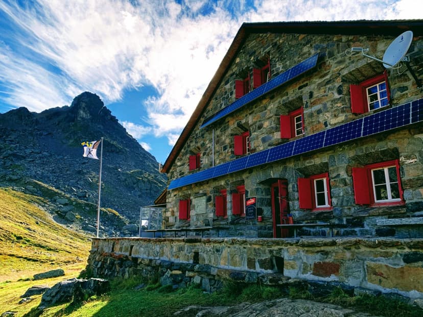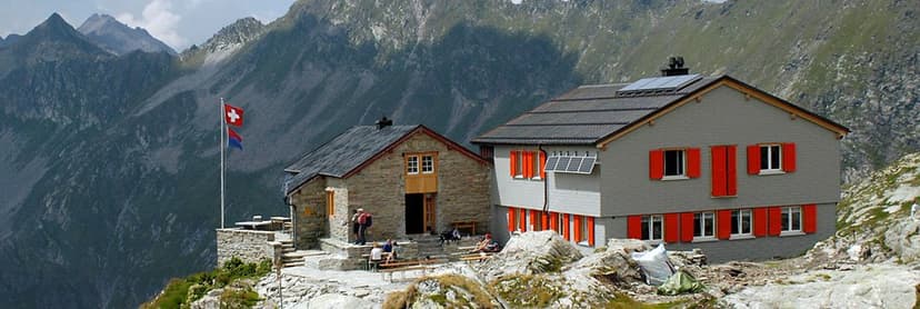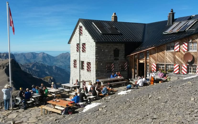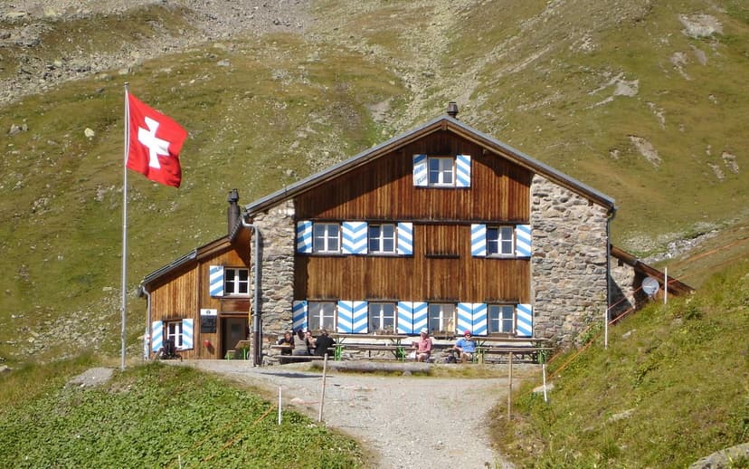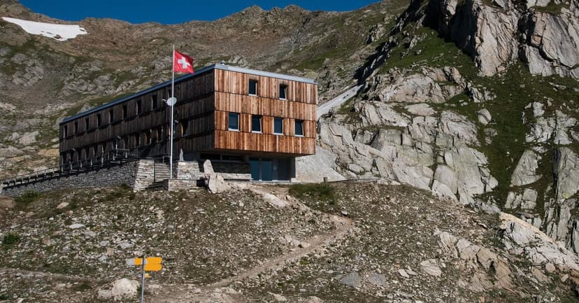Du har klättrat i fem timmar. Stigen når en stenig axel i Pennine Alperna, och där är det — en stenbyggnad som ligger ovanför en glaciärsjö, den schweiziska flaggan spänd i vinden, en terrass full av vandrare som njuter av kalla öl i eftermiddagssolen. Du släpper din ryggsäck, snörar av dig kängorna och sätter dig ner med en utsikt som får de sista 1 200 metrarna av höjdökning att kännas som en rättvis affär.