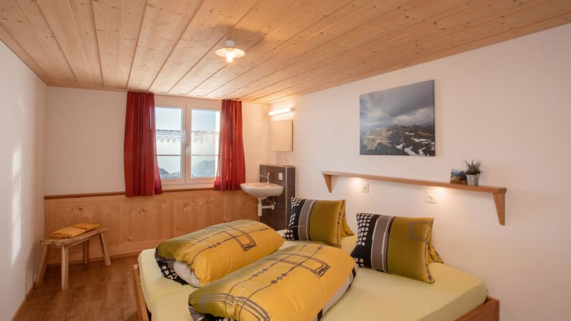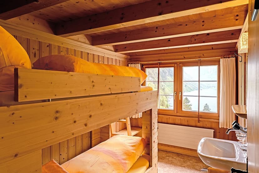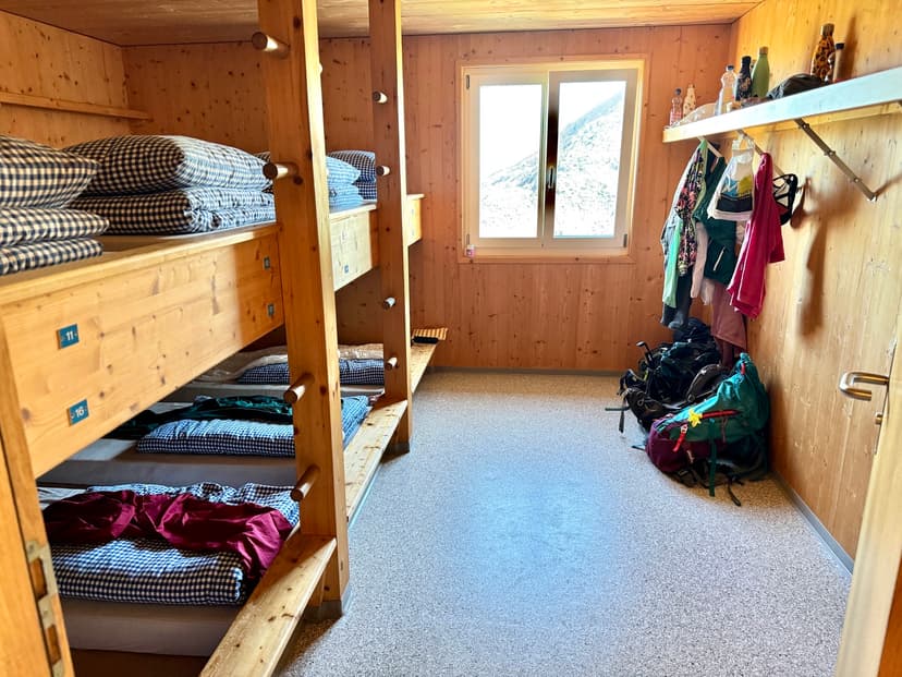 14:00–16:00 — Ankomstfönster. Checka in med stugvärden, få din kojetilldelning, byt vandringskängor mot stugskor i skotuvrummet (Schuhraum), och ställ ifrån dig din ryggsäck. Ingen bär smutsiga kängor in i en schweizisk stuga.